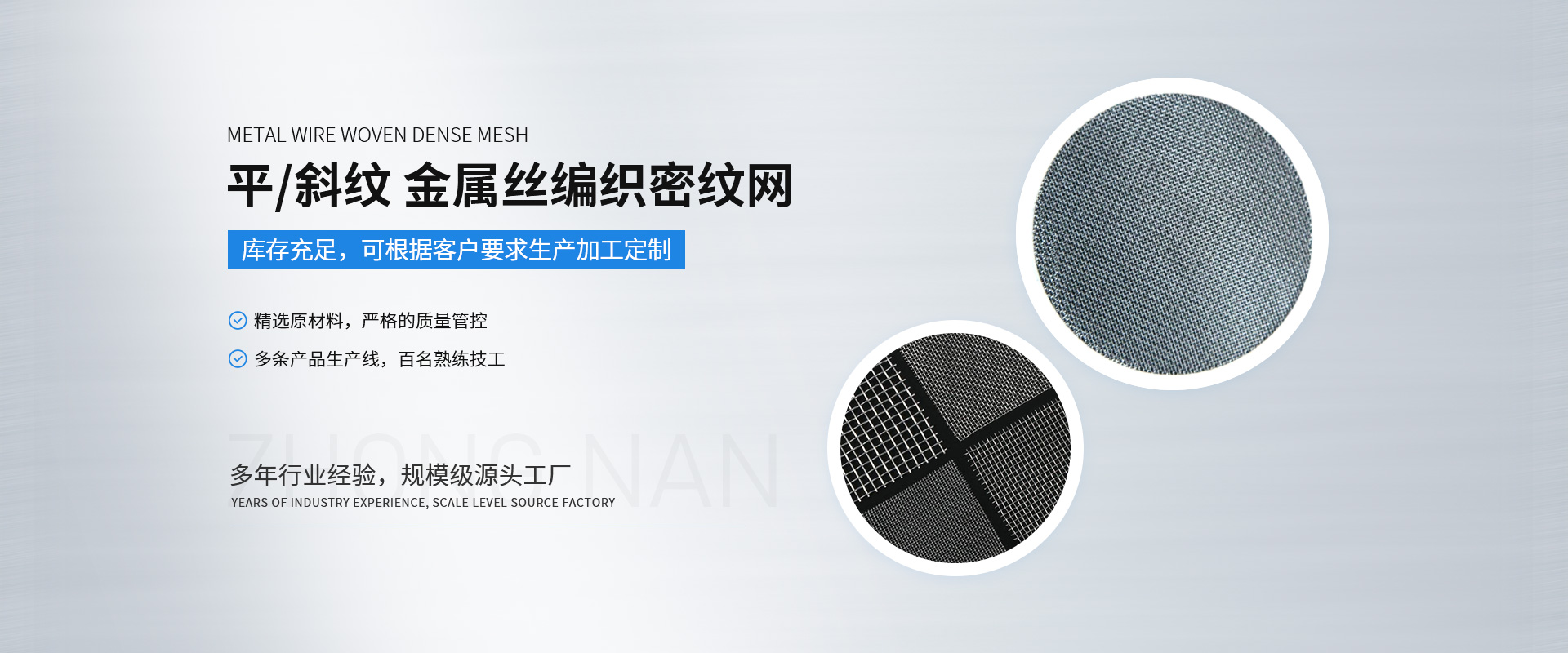 新鄉(xiāng)市中南金屬網(wǎng)有限公司成立于1999 年,公司設(shè)在河南省新鄉(xiāng)市。在過去的十幾年來,我們堅(jiān)持以嚴(yán)格的管理措施、雄厚的技術(shù)力量、良好的工藝設(shè)施,質(zhì)量上乘、信譽(yù)為上為原則,把樹立良好的企業(yè)形象為工作宗旨,歷經(jīng)市場(chǎng)的嚴(yán)峻考驗(yàn)并贏得廣大用戶的一致好評(píng)。金屬絲網(wǎng)編織結(jié)構(gòu)形式有平紋和斜紋兩種方法,嚴(yán)格按照航空軍品標(biāo)準(zhǔn)HB1862—93和標(biāo)準(zhǔn)GB/T5330—2003標(biāo)準(zhǔn),并等效采用國際標(biāo)準(zhǔn)ISO9044—90標(biāo)準(zhǔn)組織生產(chǎn)。 公司擁有生產(chǎn)設(shè)備和技術(shù)人員,主要生產(chǎn)不銹鋼篩網(wǎng)、磨料網(wǎng)、金屬絲編織方孔網(wǎng)、篩網(wǎng)、濾網(wǎng) 、篩分網(wǎng) 、過濾網(wǎng)、不銹鋼網(wǎng)、絲網(wǎng)、金屬絲網(wǎng)、金屬絲編織密紋網(wǎng)、特種網(wǎng)、不銹鋼密紋網(wǎng)、荷蘭網(wǎng)、席型網(wǎng)。絲網(wǎng)材質(zhì)選用黃銅、錫青銅、不銹鋼、純鎳等。席型網(wǎng)規(guī)格7/44目—500/3500目,方孔網(wǎng)規(guī)格1/2目—500目,網(wǎng)孔25mm—0.028mm,產(chǎn)品廣泛用于機(jī)械、化工、化纖、石油、醫(yī)藥、橡膠、濾芯、固體果粒篩分、流體過濾以及裝飾、防塵、骨架支撐等。 我們以“視質(zhì)量為生命、以信譽(yù)求生存、以科技促發(fā)展、以優(yōu)*產(chǎn)品為客戶服務(wù)”的經(jīng)營理念,真誠的希望與各界人士攜手并進(jìn),共創(chuàng)輝煌!